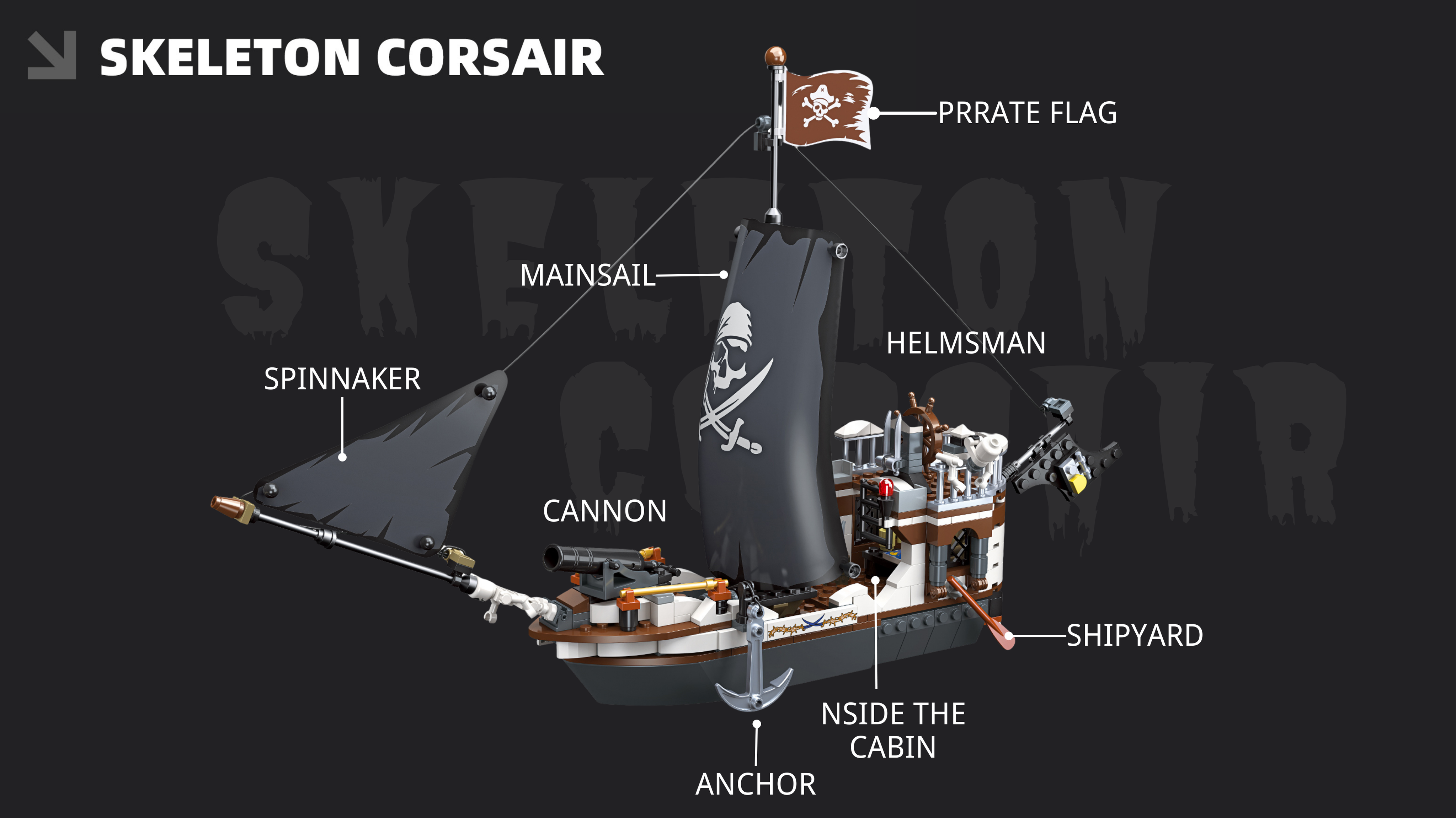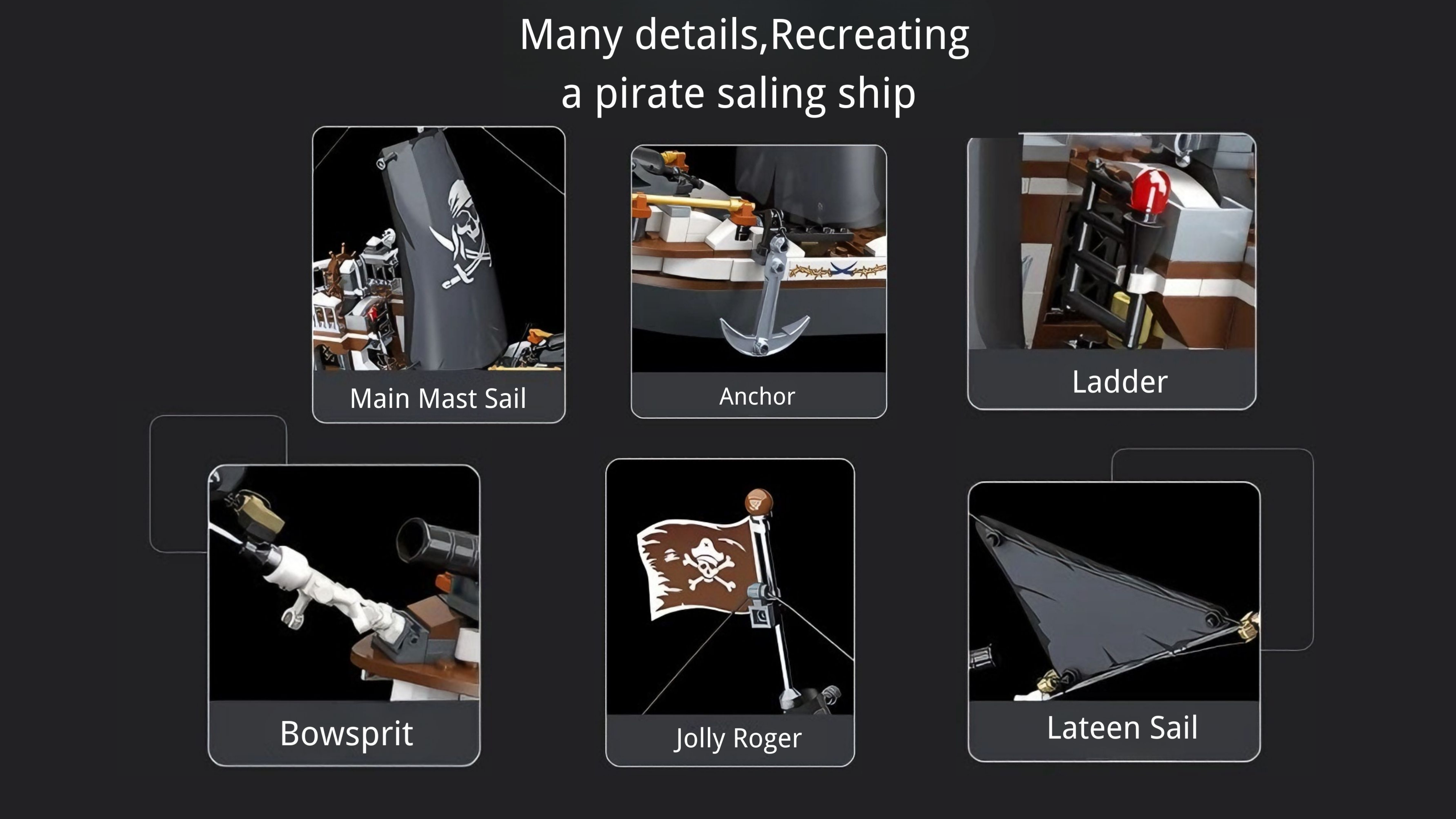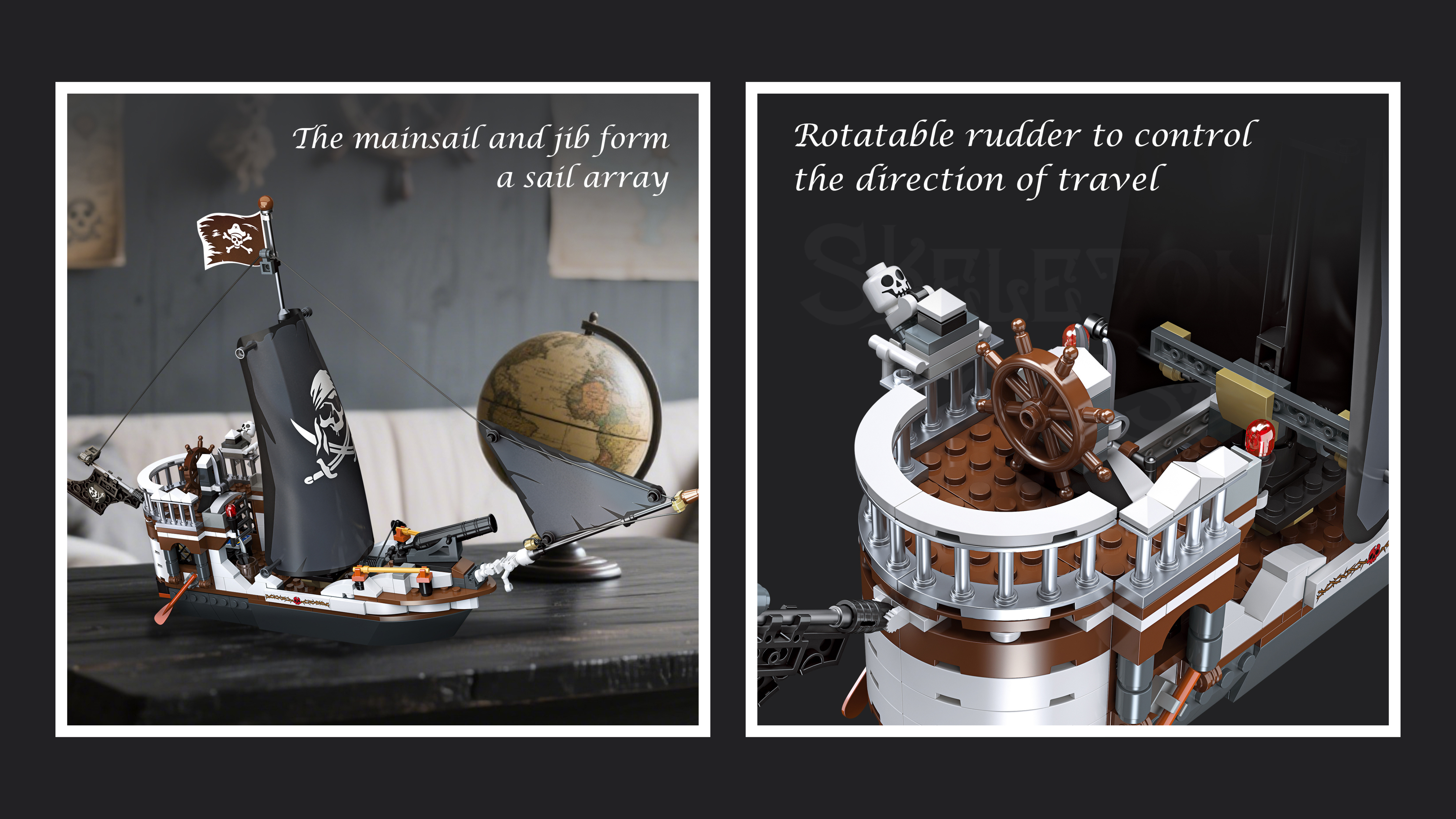 The rotatable rudder that spun smoothly,cannons that slid in and out of gunports,and threading those tiny ‘ropes’ between masts (tedious, but so rewarding when the sails billowed).Even the hidden cabin—with a mini globe and slouched skeleton—felt like a secret story:this pirate was mid-heist planning when the storm hit.